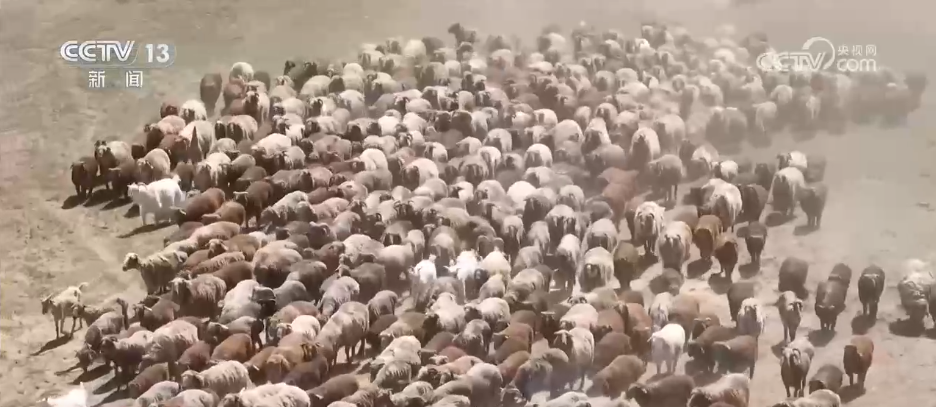 在新疆阿勒泰福海县的沙尔布拉克草原,当地牧民穿着漂亮的特色服饰,带着家当,赶着牛羊,正在进行转场。今年有45万头的牛羊经过沙尔布拉克草原千年牧道,转场到水草丰美的夏牧场。