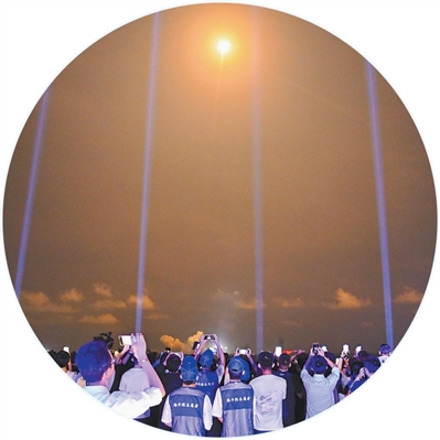 “5,4,3,2,1”——火箭的火焰照亮夜幕,平台的光束射向天际……19时50分,火箭发射升空,游客们举着手机记录,现场欢呼声阵阵。“很兴奋、很震撼,感觉一伸手就能‘抓’到火箭。”延钰菲说。