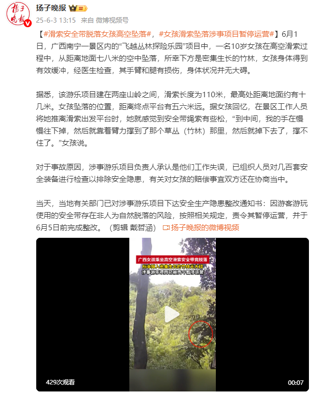 6月1日,广西南宁一景区内的“飞越丛林探险乐园”项目中,一名10岁女孩在高空滑索过程中,从距离地面七八米的空中坠落,所幸下方是密集生长的竹林,女孩身体得到有效缓冲,经医生检查,其手臂和腿有损伤,身体状况并无大碍。