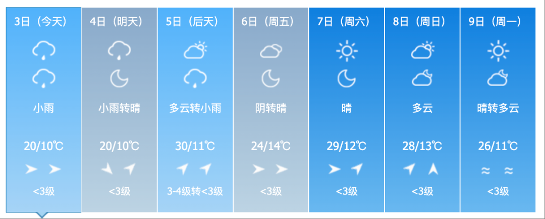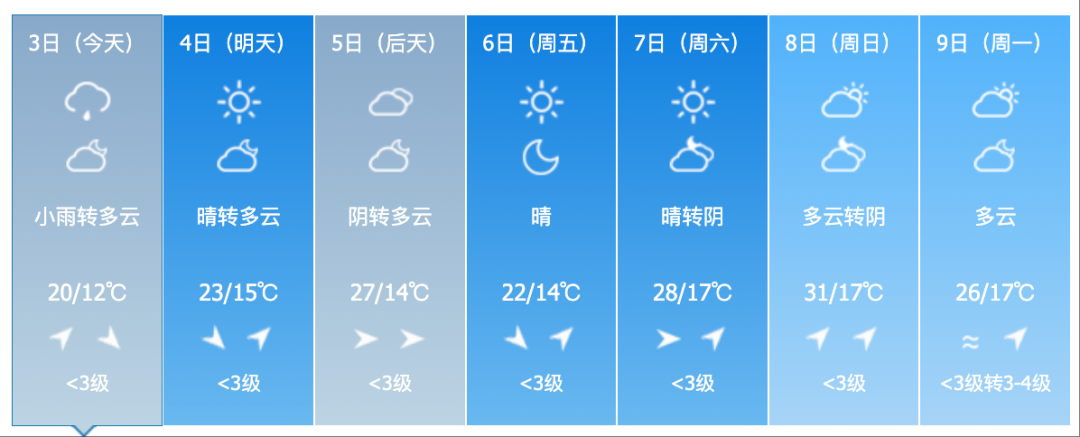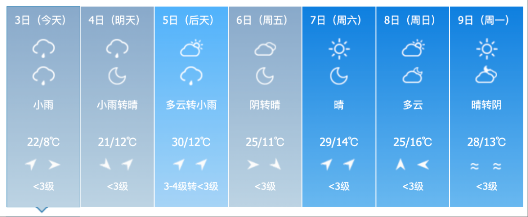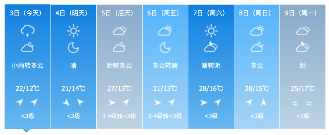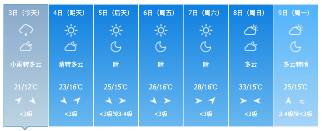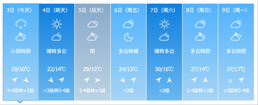 预计今天午后到明天白天,全省大部分地区有3级左右偏南风转西北风。