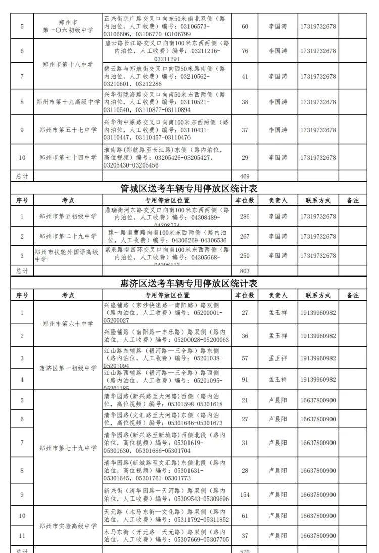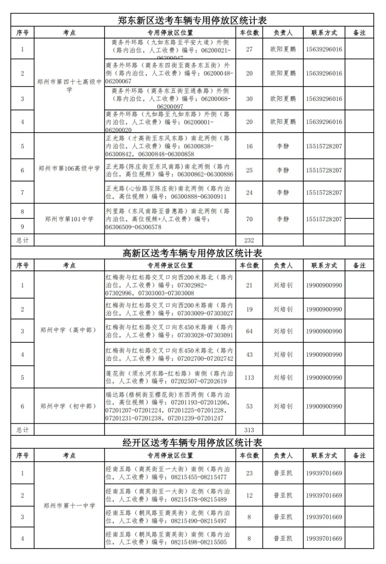 附:高(中)考期间郑州各区停车服务保障24小时值班电话