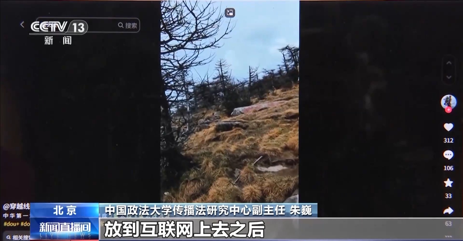 中国政法大学传播法研究中心副主任 朱巍:通过这种野外探险的方式去获取关注和流量,有了流量之后可以带一些货。比如说有一些户外用品,比如说像帐篷、旅游鞋,包括冲锋衣等等,所以他拍摄这个视频的目的归根到底还是一种商业目的。