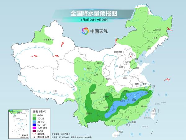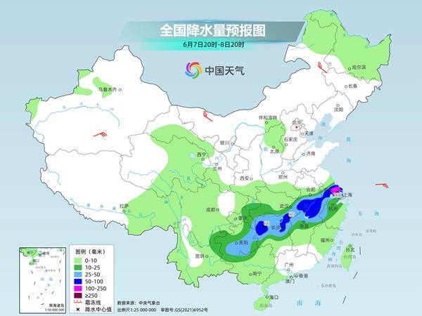 7日夜间至8日,湖南西部和东北部、湖北东南部、安徽中南部、江西北部、江苏南部、上海等地部分地区有暴雨或大暴雨。