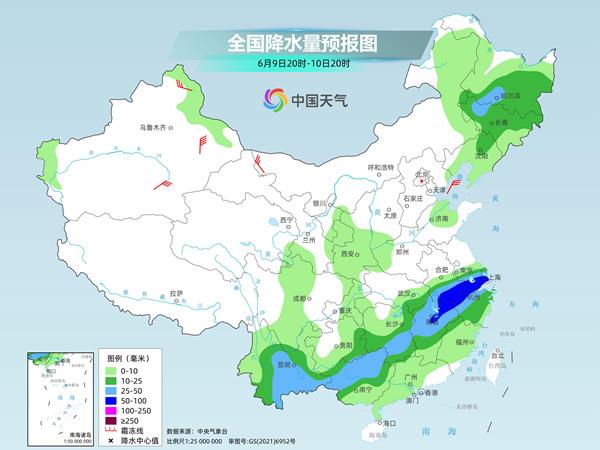 9日至10日,雨带大致呈现东北—西南走向,其中,10日安徽南部、江苏南部、上海、浙江北部、江西北部等地有大到暴雨。