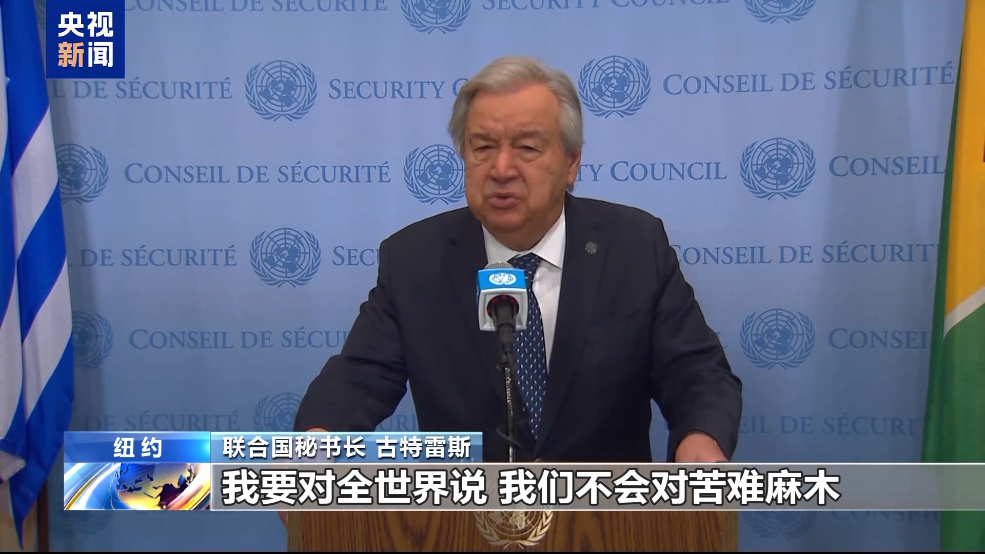 联合国秘书长 古特雷斯:我要对全世界说,我们不会对苦难麻木,我们不会接受联合国人员的无端被杀,我们不会接受人道工作者、记者、医护人员或平民,在任何情况下遭杀害成为常态。我们绝不能容忍有罪不罚。