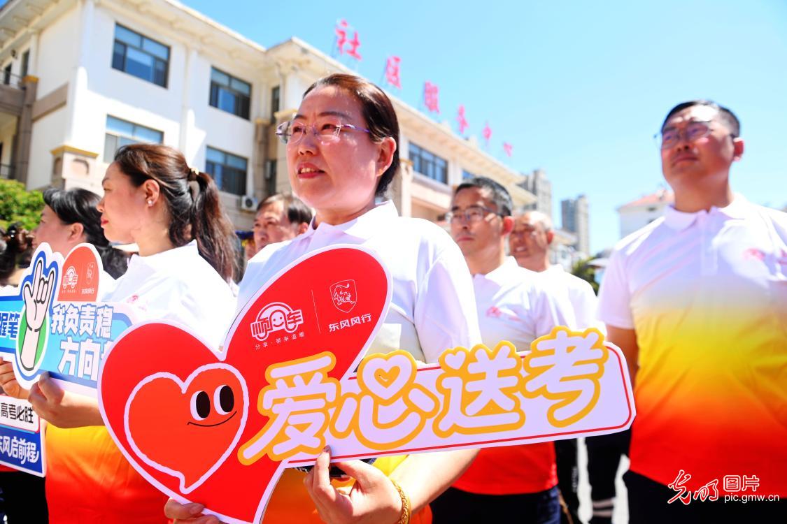 在山东青岛银屏山路社区,由青岛公益顺风车应急救援队和当地街道、社区以及爱心企业发起的“爱心送考行”活动正式启动。自即日起至高考结束前,义务为高考考生提供各种应急救援服务,确保考生高考无忧。(俞方平摄/光明图片)