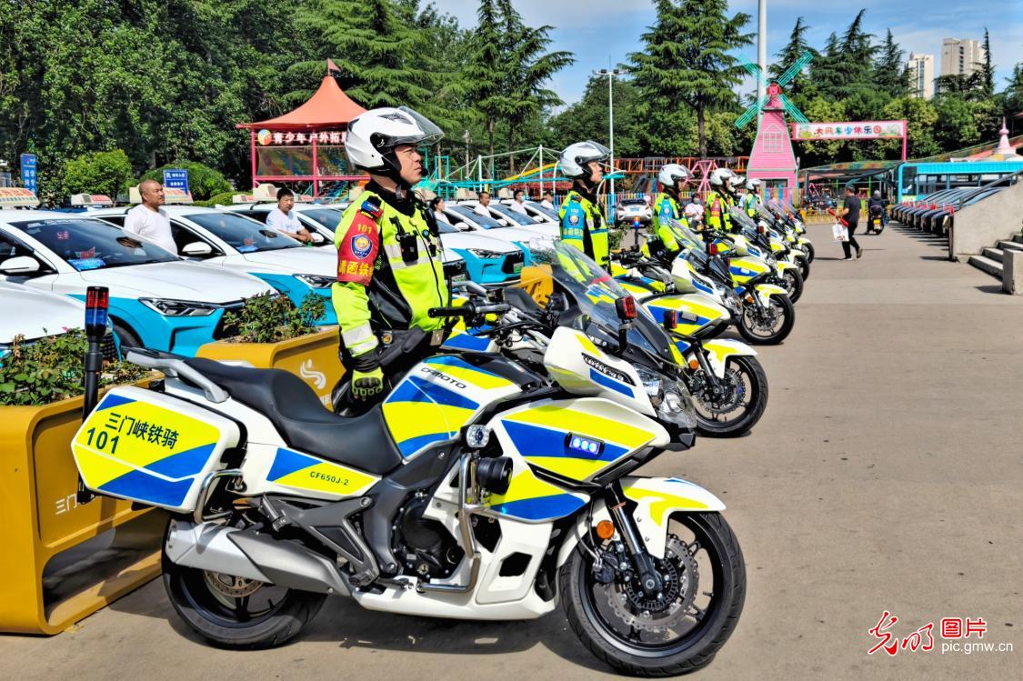 河南省三门峡市启动“任你乘风破浪,保你追逐梦想”第十五届爱心送考公益活动,交警铁骑、“爱心送考”车队整装待发。