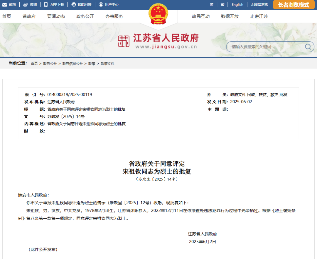 近日,江苏省人民政府发布关于同意评定宋祖钦同志为烈士的批复。