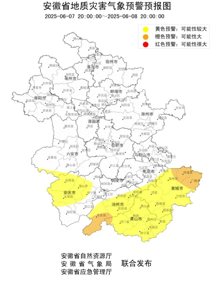 6月7日20时至6月8日20时,宣城市广德市、宣州区、郎溪县,池州市东至县、石台县,黄山市祁门县发生地质灾害可能性大,请加强防范,同时做好灾害隐患点上人员转移准备工作;黄色预警:宣城市宁国市、泾县、旌德县、绩溪县,池州市贵池区、青阳县,黄山市屯溪区、徽州区、黄山区、歙县、休宁县、黟县,安庆市潜山市、桐城市、岳西县、太湖县、宿松县、怀宁县,六安市金寨县、霍山县,芜湖市湾沚区、南陵县发生地质灾害可能性较大,请注意防范,并加强隐患巡查和排查,一旦发现隐患,提前避险转移。