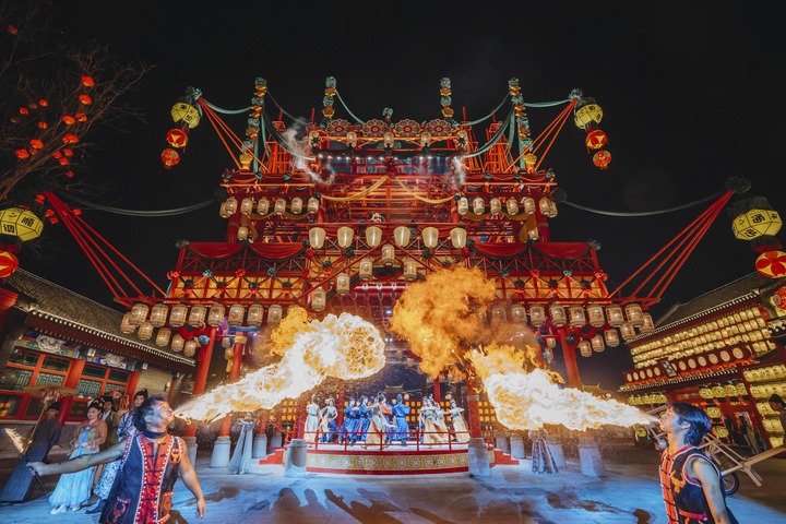 2025年6月2日晚,演员在河北省唐山市丰南区河头老街景区为游客演出。新华社发(刘满仓摄)