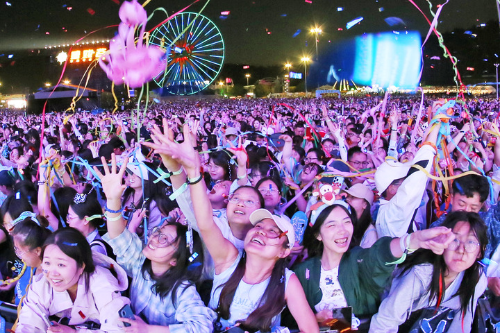 2025年5月1日晚,人们在江苏常州太湖湾音乐节上欢呼。新华社发(陈暐摄)