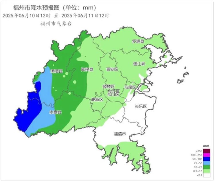 福州市气象台10日12时20分继续发布 “暴雨预警Ⅳ级” ! 今天午后到夜里有小到中雨伴有雷电,内陆局部大雨到暴雨(见附图)。24小时累计雨量为30~50毫米,局部超过70毫米;最大小时雨强40~50毫米。雷雨时局地伴有短时强降水、7~9级大风等强对流天气。