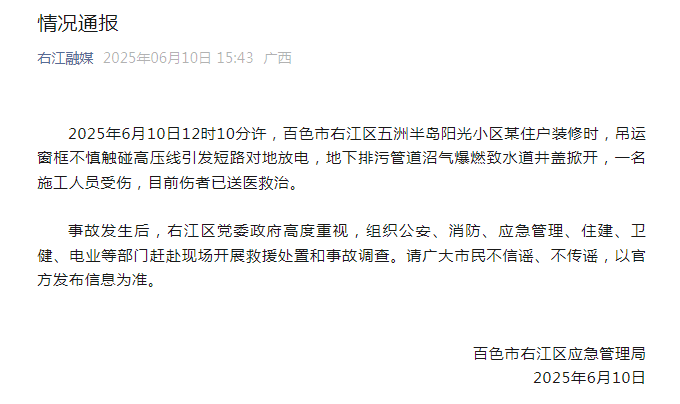 2025年6月10日12时10分许,百色市右江区五洲半岛阳光小区某住户装修时,吊运窗框不慎触碰高压线引发短路对地放电,地下排污管道沼气爆燃致水道井盖掀开,一名施工人员受伤,目前伤者已送医救治。