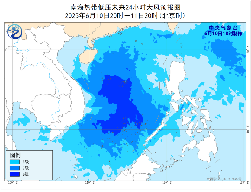 大风预报: 6月10日20时至11日20时,巴士海峡、南海大部、琼州海峡、广东沿海、海南岛东部沿海将有6-7级大风,南海中部和南部的部分海域、西沙群岛、南沙群岛和中沙群岛附近海域的风力将有8级,阵风可达9-10级。