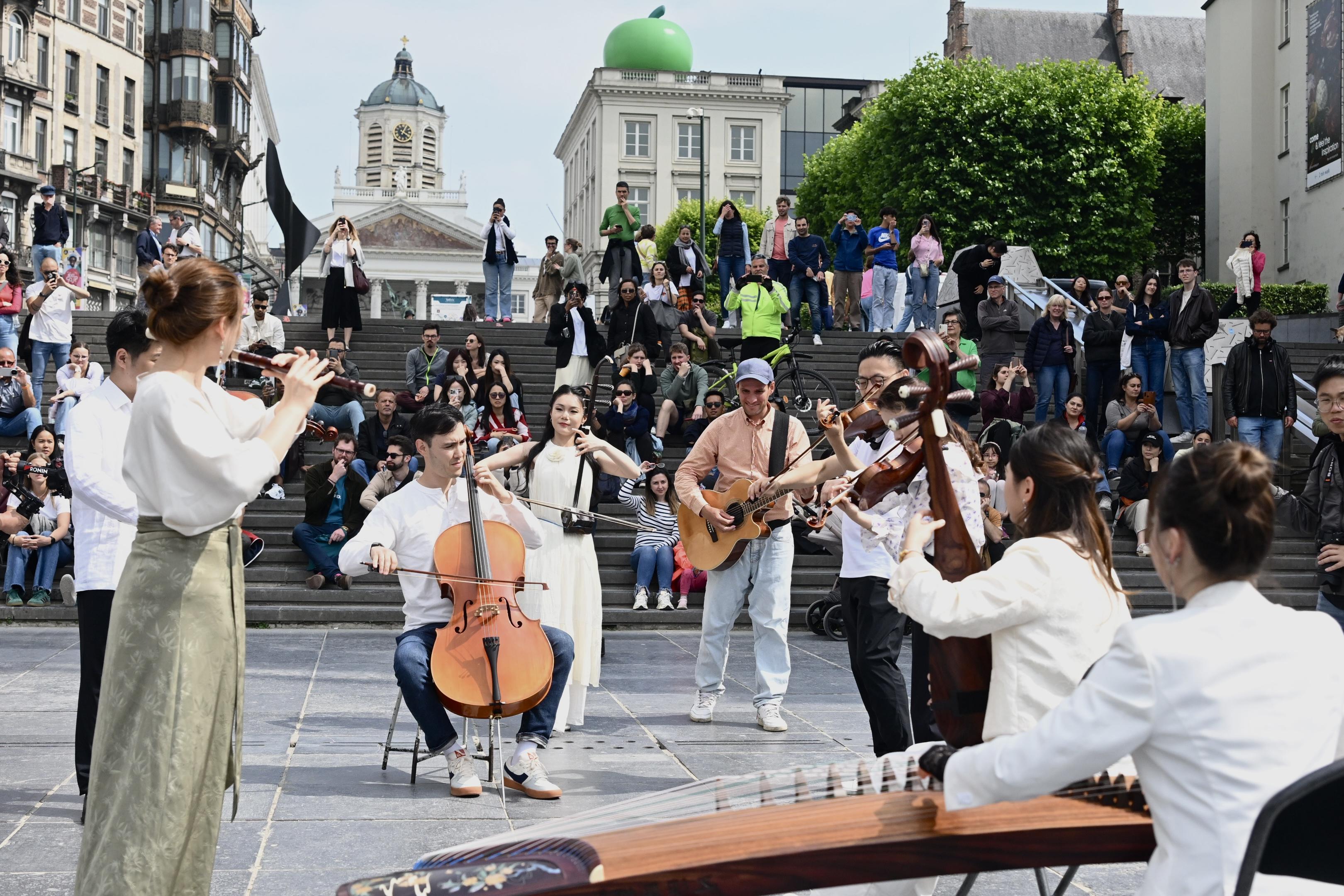 中国和比利时的文明交流历史久远,2025年是中国与欧盟建交50周年。当地时间6月9日下午,一场快闪活动拉开了“文明遇·鉴:中国大运河文化江苏周”序曲,江苏民乐《好一朵茉莉花》和惊艳的戏服起舞,引得当地市民驻足围观。