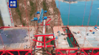 此次吊装的钢桁梁长11.2米,桁高7.5米,重100吨。全桥共计34节钢桁梁,总重约1.02万吨。
