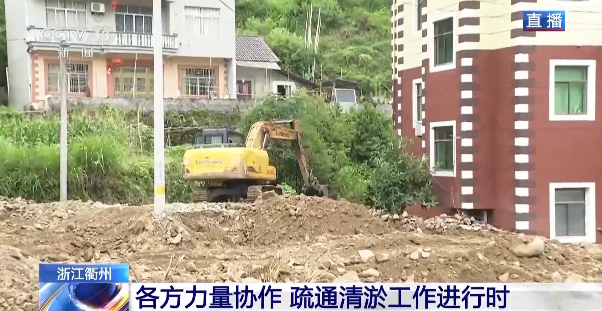 受强降雨影响,昨天(6月10日),浙江衢州市衢江区上方镇新京村出现山体塌方,农田、村道、房屋不同程度受损,清淤工作正在进行。