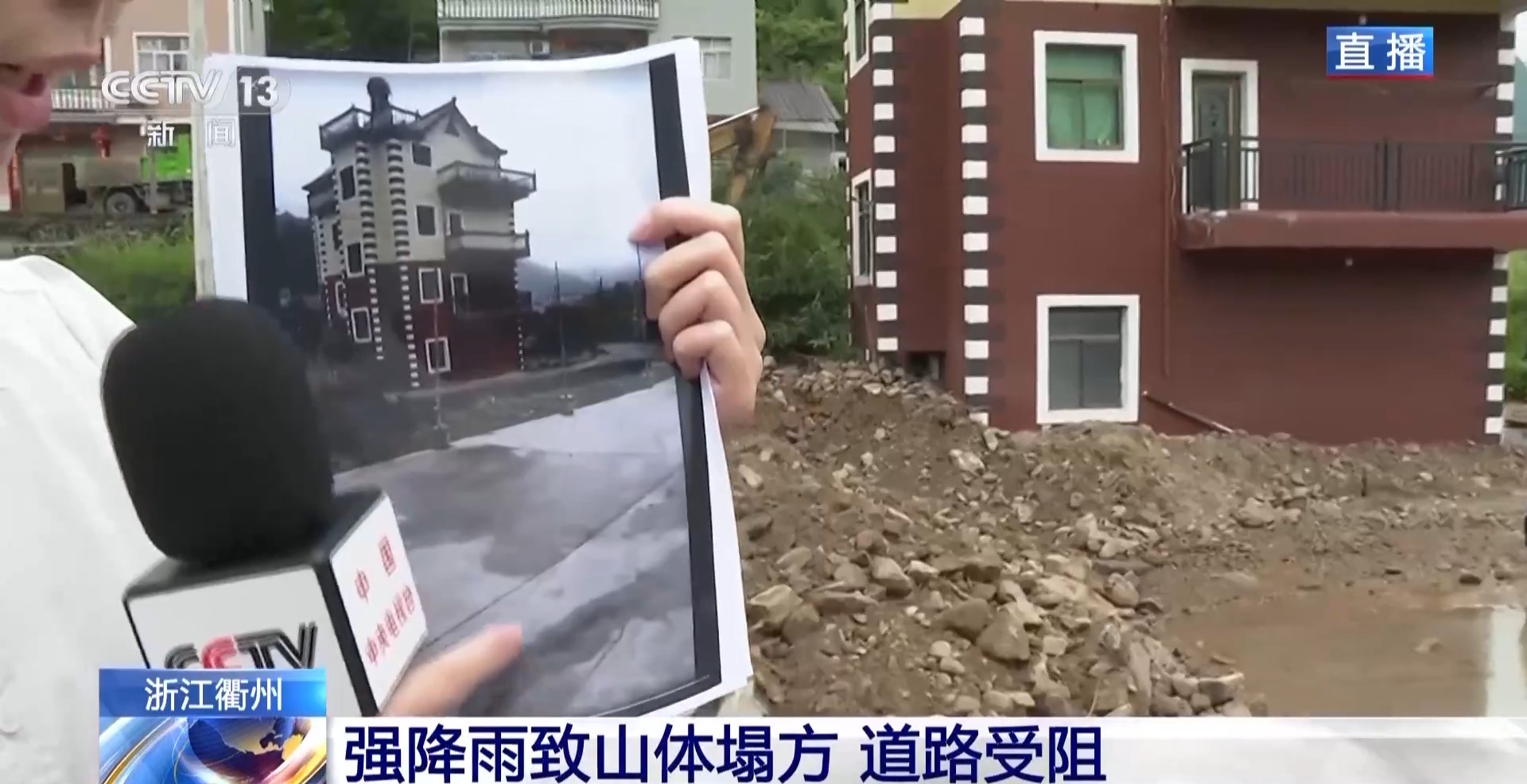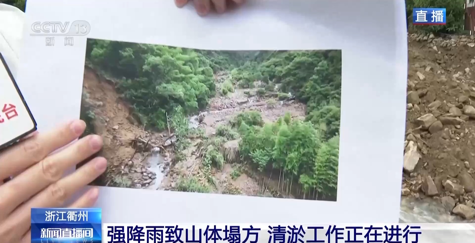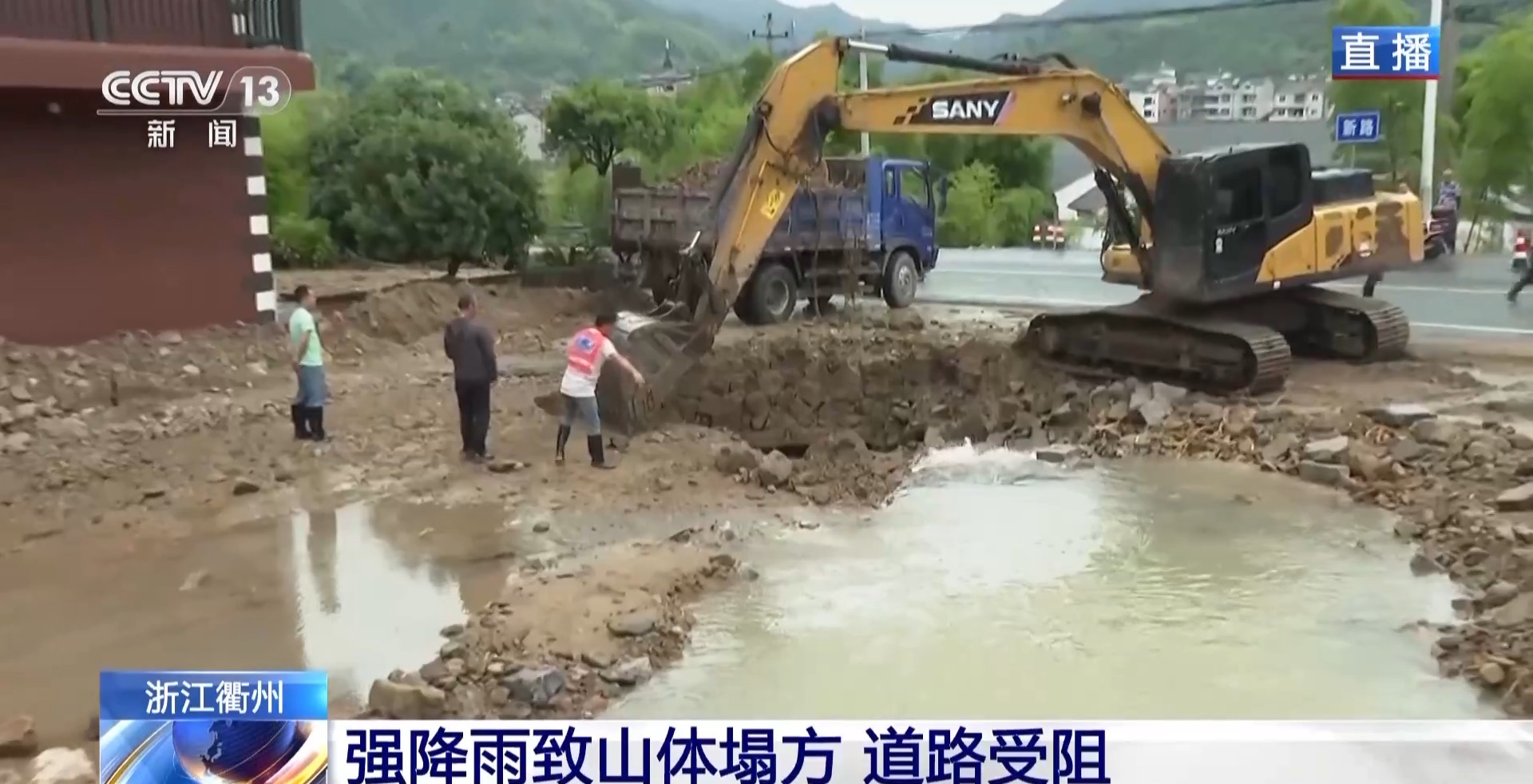 总台记者 廖望:现在可以看到淤泥、石块堆积在路面上,山上的溪水还在往下流,在底部形成积水,工作人员正在处理。