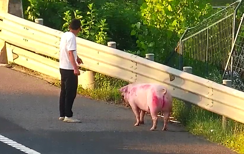 6日清晨,一头肥猪跨栏“越狱”从高速行驶的大货车上纵身一跃,在宁杭高速公路南京段的路面上翻滚几圈后,挣扎着站立于高速公路的行车道,吓得众司机纷纷避让。所幸,货车司机及时发现并报警采取措施,将大肥猪引到应急车道,最终众人合力将其重新装车。