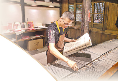 刻好的字模按照次序排在储字盘里备用。排版时,王法万心中默念着口授心传的“拣字诗”,迅速在上万个字块中把所需字块挑出来,逐一放入漆黑发亮的木框印版中。