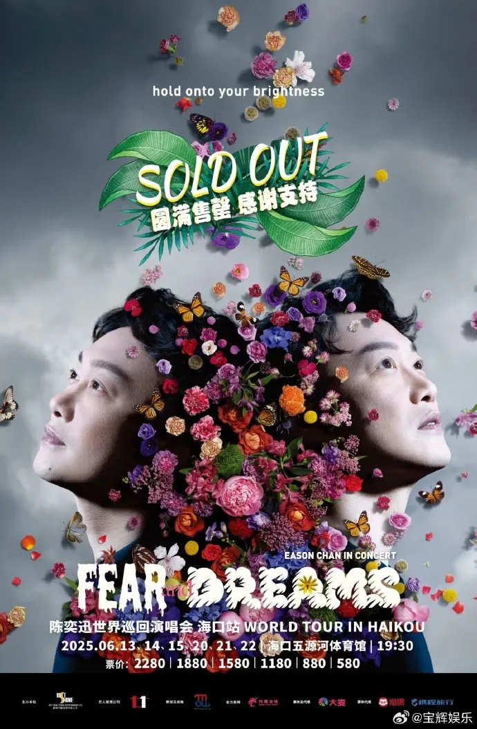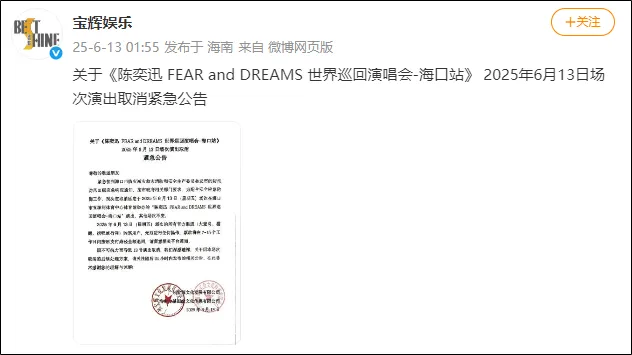 6月13日凌晨1:55,@宝辉娱乐 发布关于《陈奕迅 FEAR and DREAMS 世界巡回演唱会-海口站》 2025年6月13日场次演出取消紧急公告。