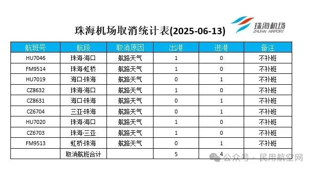 6月13日,珠海机场取消出港航班5班,进港航班4班,详见下图,请出行旅客及时留意航班信息,与所购票航空公司联系,合理安排出行。