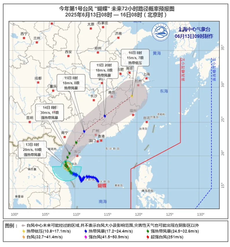预计,“蝴蝶”将以每小时10公里左右的速度向偏北方向移动,紧擦海南岛西部近海北上,之后将于14日中午前后在广东徐闻到广西北海一带沿海登陆。