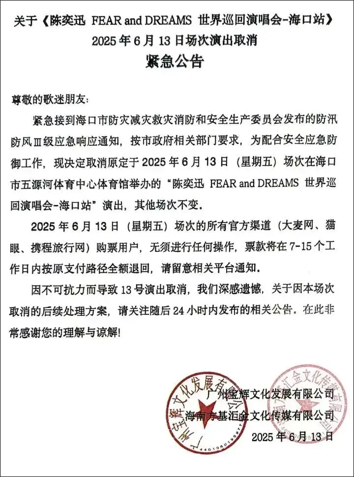 紧急接到海口市防灾减灾救灾消防和安全生产委员会发布的防汛防风Ⅲ级应急响应通知,按市政府相关部门要求,为配合安全应急防御工作,现决定取消原定于2025年6月13日(星期五)场次在海口市五源河体育中心体育馆举办的“陈奕迅FEAR and DREAMS世界巡回演唱会-海口站”演出,其他场次不变。