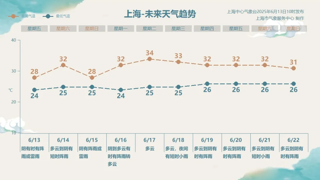下周初,副热带高压加强北抬,上海受副热带高压影响,有2-3天的降水间歇期,气温进一步上升,最高气温接近34℃,需注意防暑降温。下周中后期,上海处在副热带高压边缘,多阵雨天气,体感潮湿闷热。