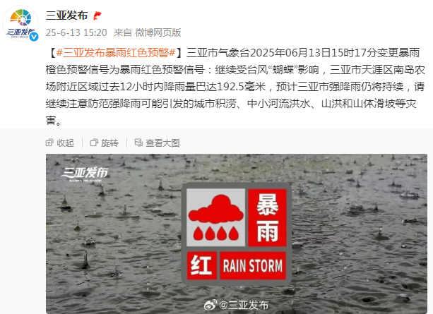 三亚市气象台2025年06月13日15时17分变更暴雨橙色预警信号为暴雨红色预警信号:继续受台风“蝴蝶”影响,三亚市天涯区南岛农场附近区域过去12小时内降雨量巴达192.5毫米,预计三亚市强降雨仍将持续,请继续注意防范强降雨可能引发的城市积涝、中小河流洪水、山洪和山体滑坡等灾害。