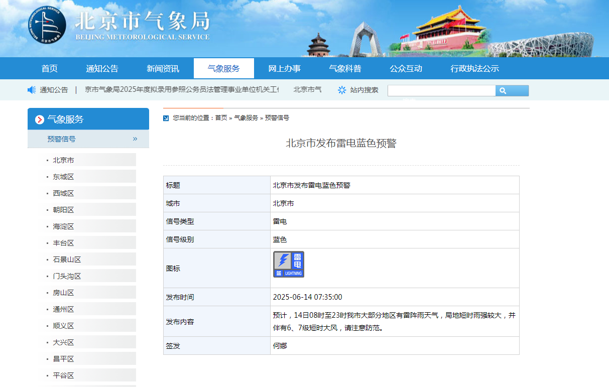 北京发布雷电蓝色预警