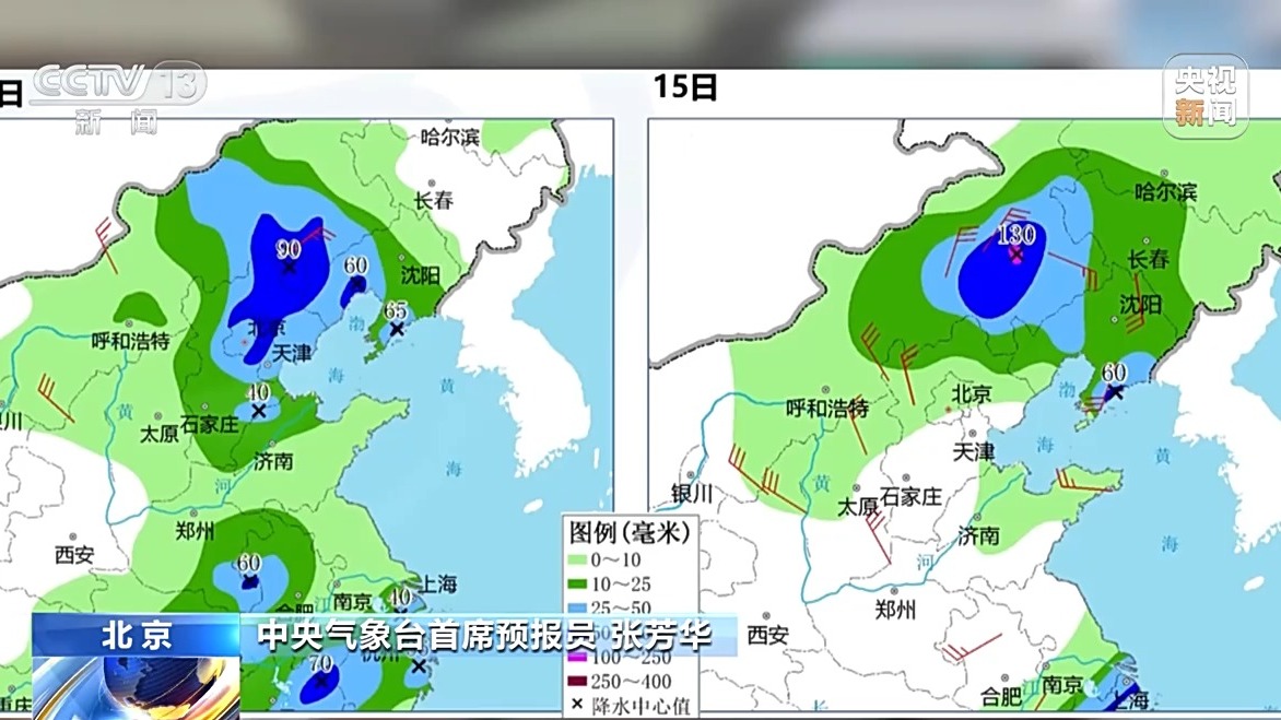 北方地区强降雨比较集中的区域,是在北京、天津、河北东北部、内蒙古东南部、辽宁西部和南部等地,可能有大到暴雨,局地可能会出现大暴雨量级的降水。