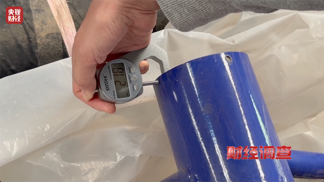 在定州市凯捷体育用品有限公司里,工作人员称该厂生产的设备均为达标产品,管壁厚度符合2.75mm的国家标准。但记者拿出随身携带的卡尺进行测量时发现,设备管材的壁厚只有2.1mm。