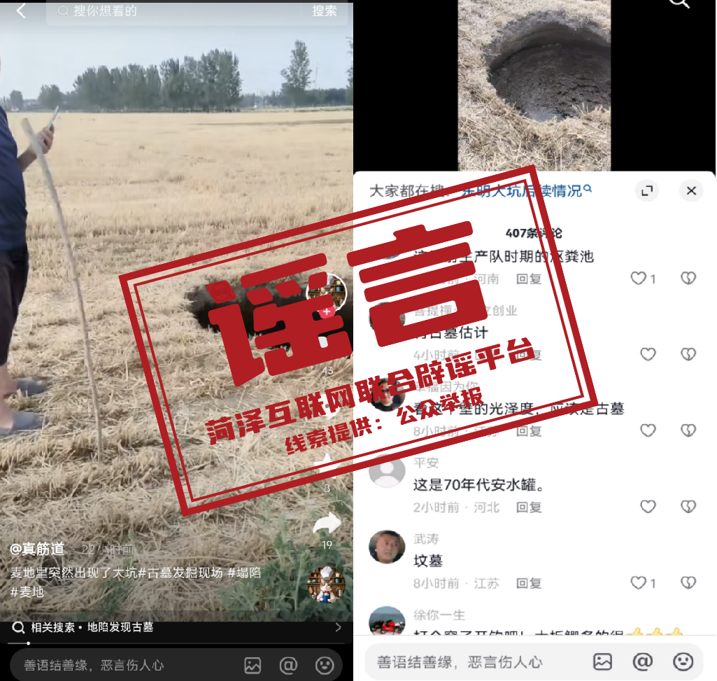 6月11日,菏泽东明县渔沃街道一农田出现大坑,引发网民关注,有网民在某平台发布视频并配文带有古墓发掘现场等文字,引发热议,有部分网民留言称是古墓遗址。