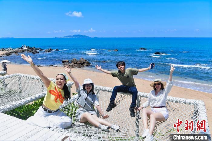 6月8日,华侨大学“海外新声代”工作室成员在三亚天涯海角游览区合影。 (海南省国际文化交流中心 供图)
