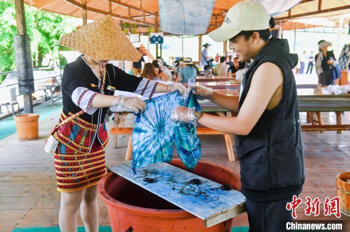 6月9日,印尼博主陈浩杰(右一)在海南槟榔谷黎苗文化旅游区体验苗族扎染。(海南省国际文化交流中心 供图)