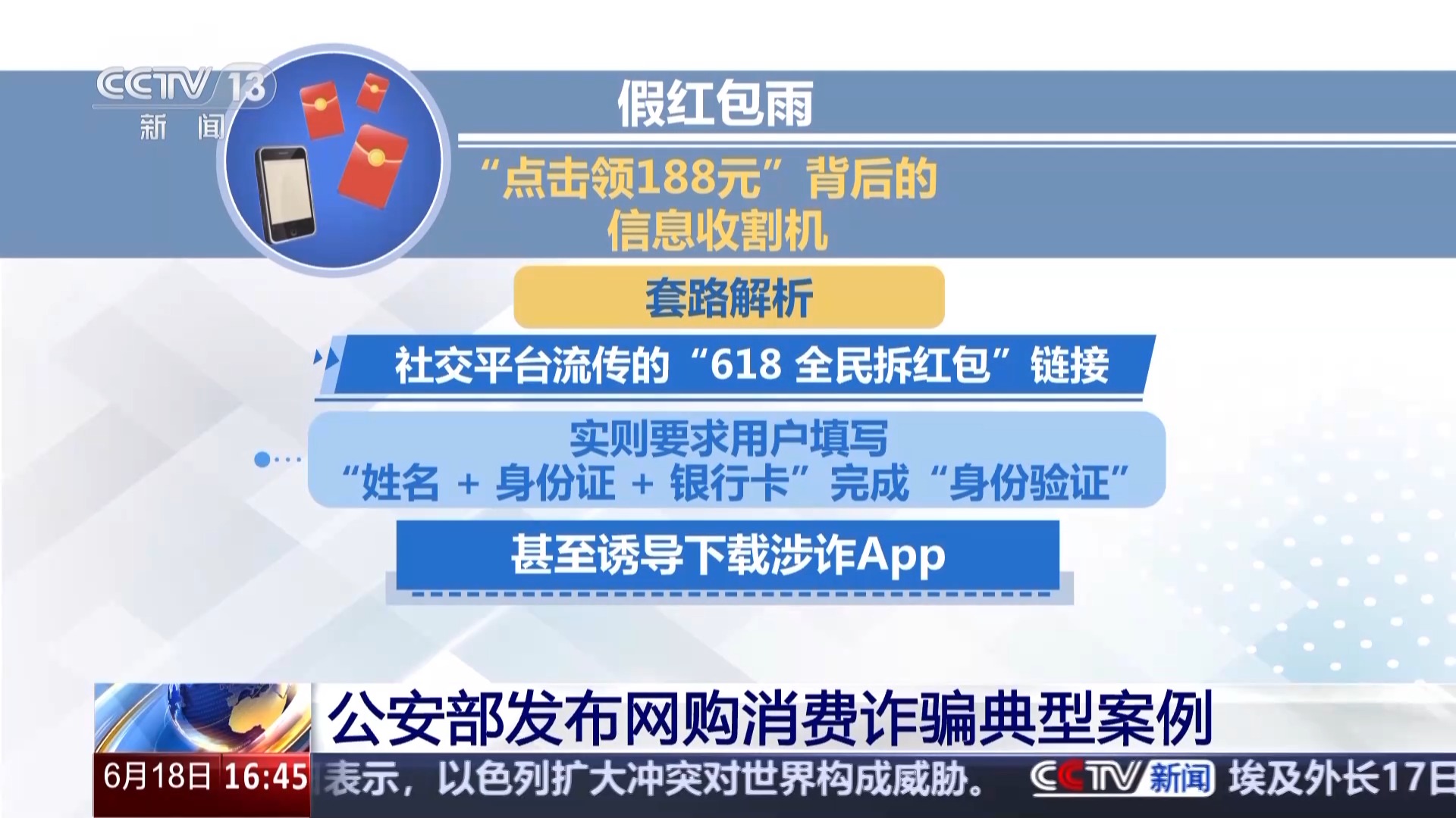套路解析:社交平台流传的“618全民拆红包”链接,实则要求用户填写“姓名+身份证+银行卡”完成“身份验证”,甚至诱导下载涉诈App。
