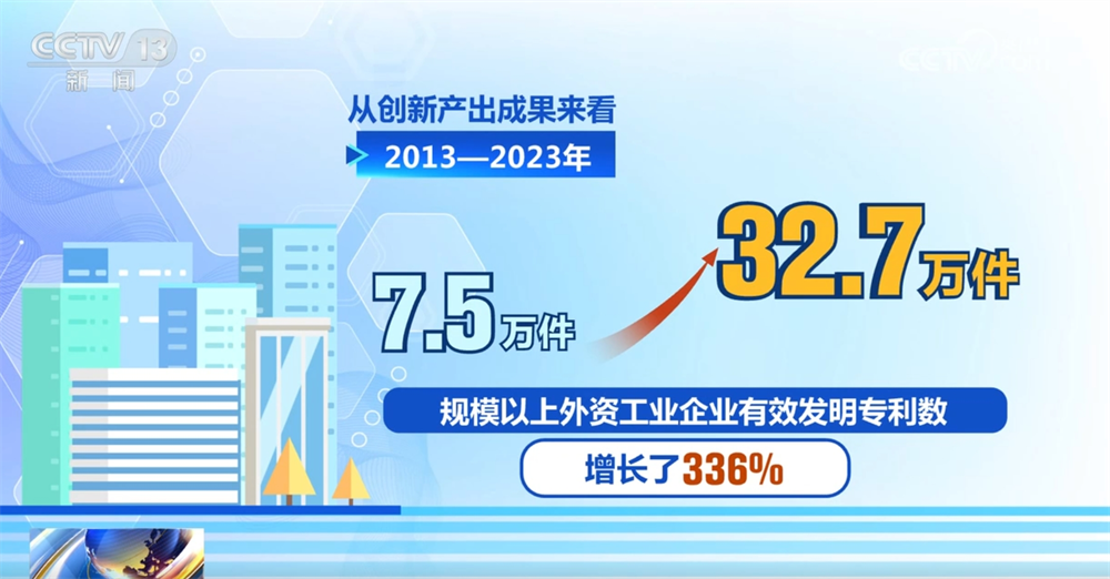 从创新产出成果来看,2013—2023年,规模以上外资工业企业有效发明专利数从7.5万件增加到32.7万件,增长了336%,新产品销售收入从4.5万亿元人民币增长至7.0万亿元人民币,增长了56.9%。跨国公司与中国的投资合作已由 “市场导向型” “成本导向型” 延伸至 “创新驱动型”。
