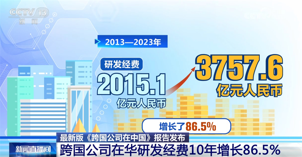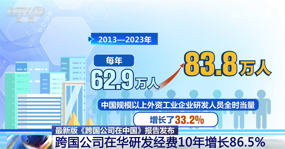 最新版《跨国公司在中国》报告显示,2013—2023年这十年,跨国公司在华研发经费增长达86.5%。