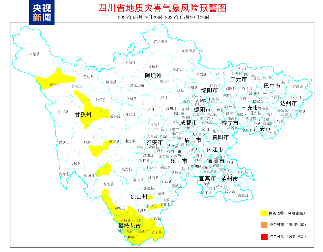 据四川省自然资源厅消息,四川省地质灾害防治指挥部办公室发布6月19日20时至6月20日20时全省地质灾害气象风险3级黄色预警,预警区域为攀枝花市:东区、西区、仁和区、米易县、盐边县;甘孜州:雅江县、道孚县、炉霍县、甘孜县、新龙县、德格县、理塘县、稻城县;凉山州:西昌市、会理市、木里县、盐源县、德昌县、会东县、宁南县、普格县、布拖县、昭觉县。
