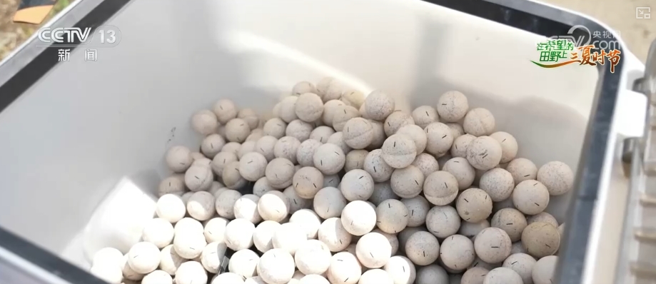 在铁岭市铁岭县凡河镇宋家泡村的一片稻田里,低空飞行的无人机不时投掷下一个个球型放蜂器。放蜂器里装着赤眼蜂卵,释放到田间后,孵化出的赤眼蜂会飞到二化螟的虫卵里产卵,降低二化螟幼虫孵化率,由此达到“以虫治虫”的效果。