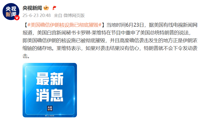 当地时间6月23日,据美国有线电视新闻网报道,美国白宫新闻秘书卡罗琳·莱维特在节目中重申了美国总统特朗普的说法,即美国确信伊朗的核设施已被彻底摧毁,并且高度确信袭击发生的地方正是伊朗浓缩铀的储存地。莱维特表示,如果对袭击结果没有信心,特朗普就不会下令发动袭击。
