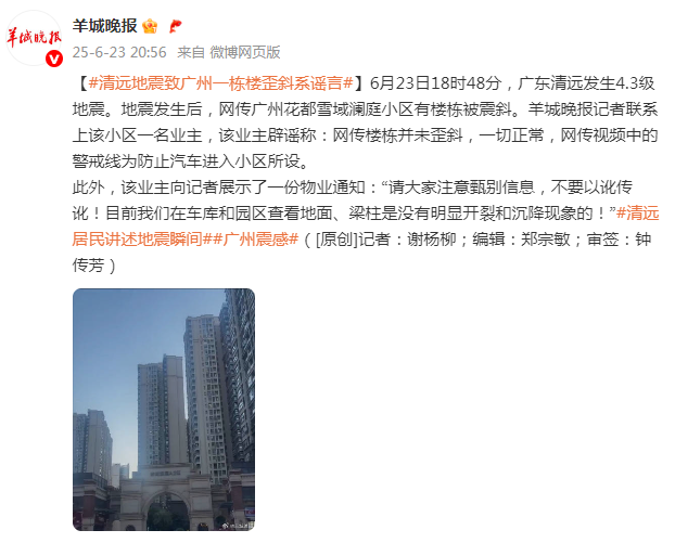 6月23日18时48分,广东清远发生4.3级地震。地震发生后,网传广州花都雪域澜庭小区有楼栋被震斜。羊城晚报记者联系上该小区一名业主,该业主辟谣称:网传楼栋并未歪斜,一切正常,网传视频中的警戒线为防止汽车进入小区所设。