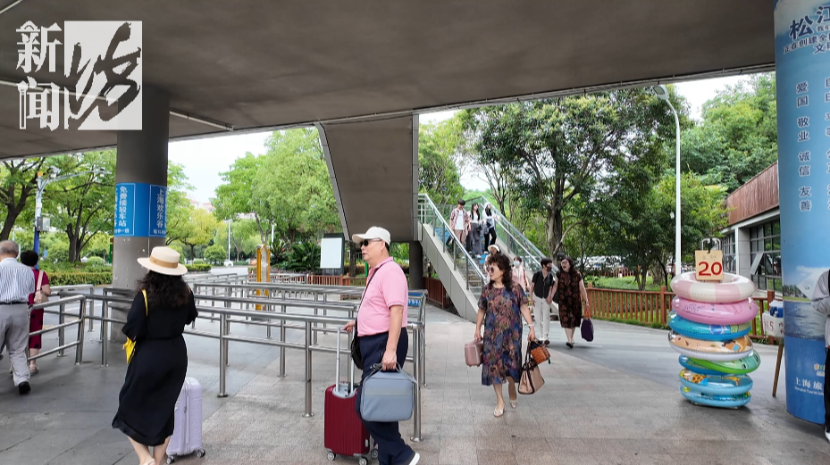 记者在现场看到,从轨交佘山站1号口出来,迎面就是一座人行天桥,马路对面是一个游客中心,前往"欢乐谷"和"玛雅海滩水公园"的免费巴士站台就位于游客中心内。