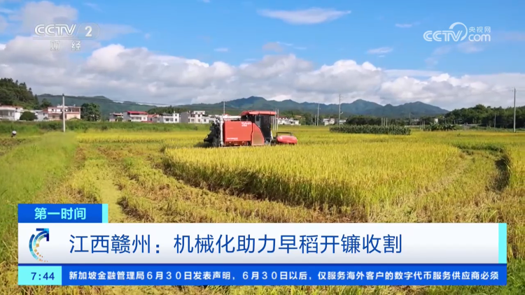 央视网消息:眼下,江西1800多万亩早稻陆续成熟收割,在赣州全南县,种植户抢抓晴好天气,全程机械化抢收早稻,与抢种晚稻无缝衔接。