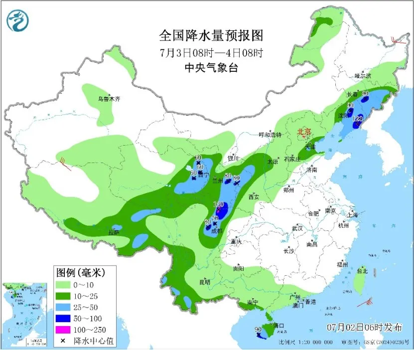 预计,7月2日14时至3日14时,山西中北部、河北中南部和东北部、北京大部、天津、山东北部、四川盆地西部、甘肃东南部、陕西西南部和北部、宁夏南部、云南西南部、广西南部沿海、海南岛西南部、辽宁中部和南部、黑龙江西北部等地的部分地区有大到暴雨,其中,河北东部、天津中东部、四川盆地西北部等地局地有大暴雨(100~160毫米)。上述部分地区伴有短时强降水(最大小时降雨量20~50毫米,局地可超过70毫米),局地有雷暴大风等强对流天气。