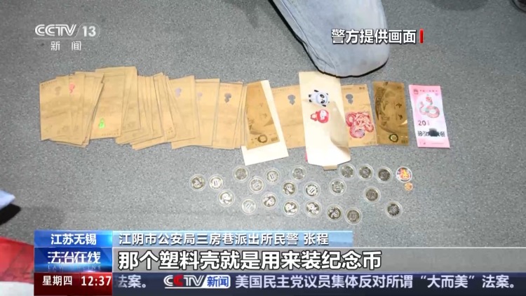 张程:5月24日当天下午,我们看到嫌疑人到厂区的东面去取了一个麻袋,然后回到他的住处,后来嫌疑人拿着一个麻袋出门的时候,我们就把他抓获了。然后在其随身的麻袋里面,我们发现了大量的塑料壳,那个塑料壳就是用来装纪念币,还有纪念钞的。