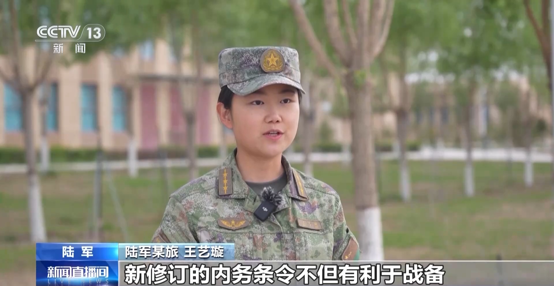 陆军某旅 王艺璇:新修订的内务条令不但利于战备,在生活中也给了我们更大的空间,在军人职责等方面都作出了更为细致的规定。我感到生活轻松了,工作思路清晰了,备战训练更有劲了。