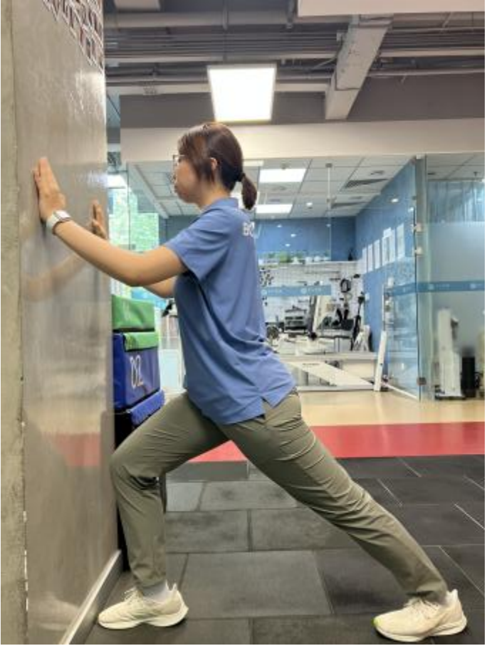 站在墙面前,双手推墙,弓箭步站立,需要牵拉的一侧在后。这时能感觉到小腿后部被拉紧,保持30秒~1分钟。