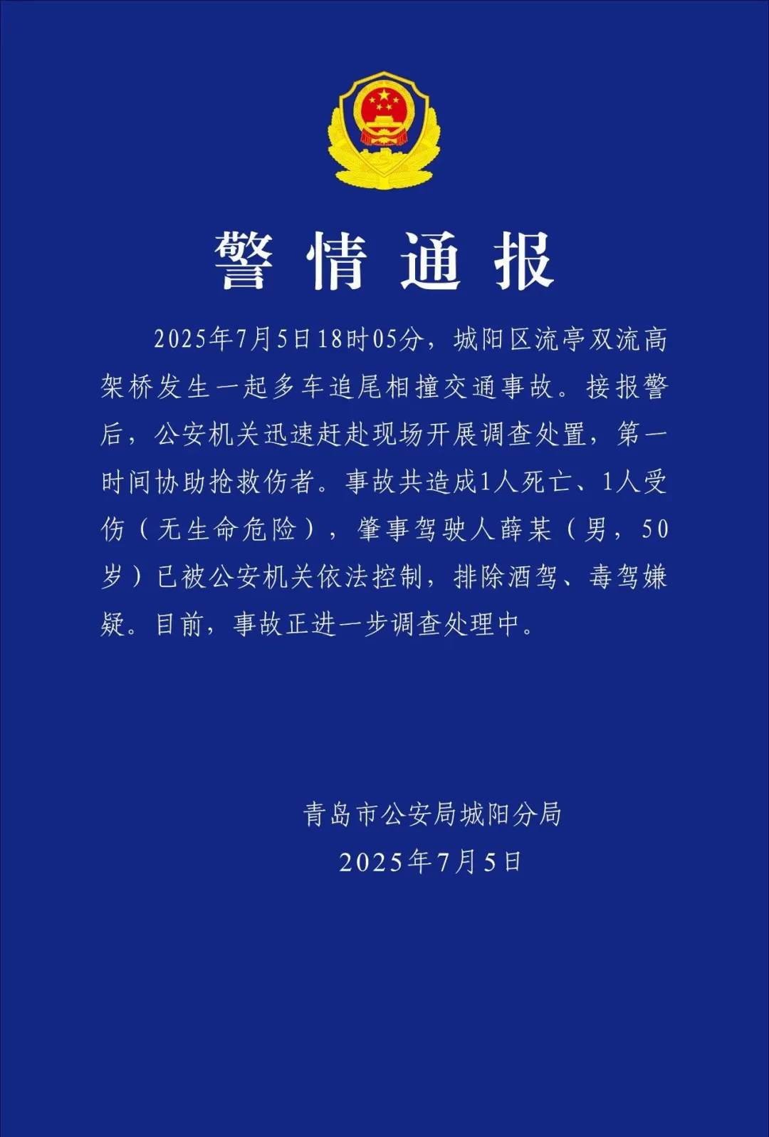 2025年7月5日18时05分,城阳区流亭双流高架桥发生一起多车追尾相撞交通事故。接报警后,公安机关迅速赶赴现场开展调查处置,第一时间协助抢救伤者。事故共造成1人死亡、1人受伤(无生命危险),肇事驾驶人薛某(男,50岁)已被公安机关依法控制,排除酒驾、毒驾嫌疑。目前,事故正进一步调查处理中。